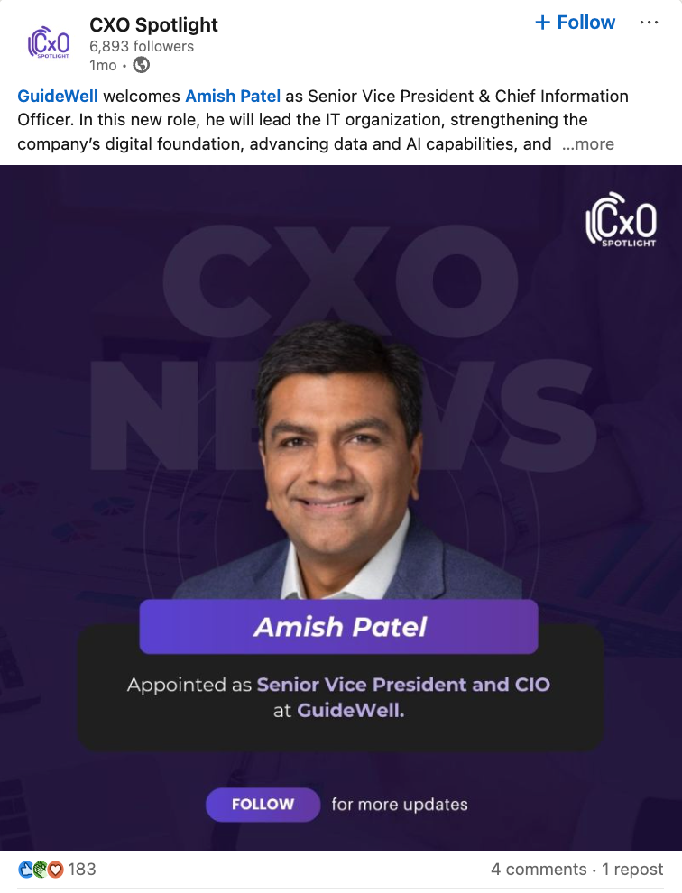 GuideWell has appointed Amish Patel as Senior Vice President and Chief Information Officer. In this role, he will lead the IT organization, strengthening the company’s digital foundation, advancing data and AI capabilities, and helping enable a simpler, more affordable care experience for members. GuideWell’s leadership materials position the appointment as part of its broader effort to modernize technology in support of members, customers, providers, and communities.