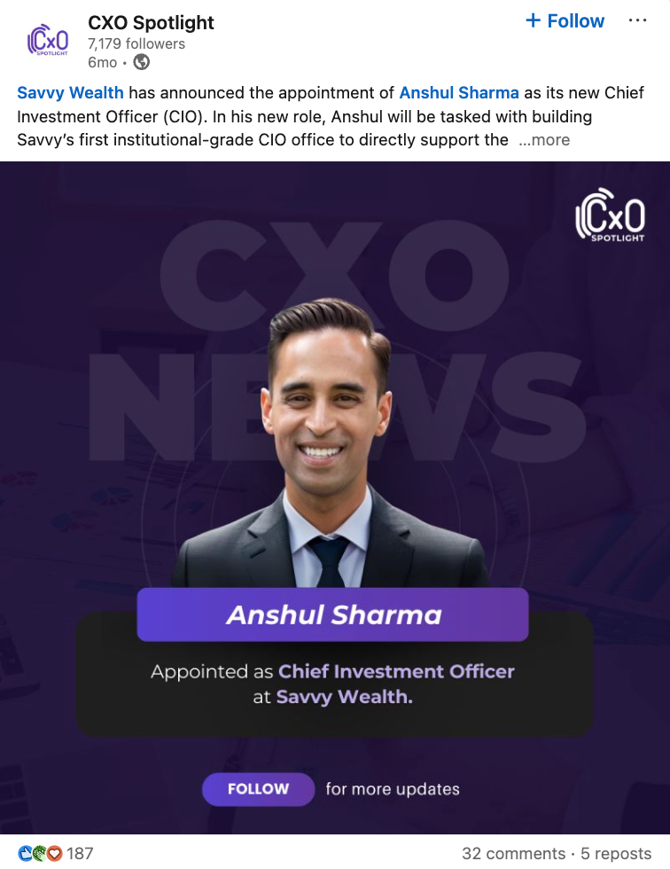 Savvy Wealth has announced the appointment of Anshul Sharma as its new Chief Investment Officer. In his new role, Sharma will be tasked with building Savvy’s first institutional-grade CIO office to directly support the firm’s growing advisor network and investment platform. The appointment comes as Savvy Wealth continues scaling its wealth management offering after surpassing $3 billion in assets under management.