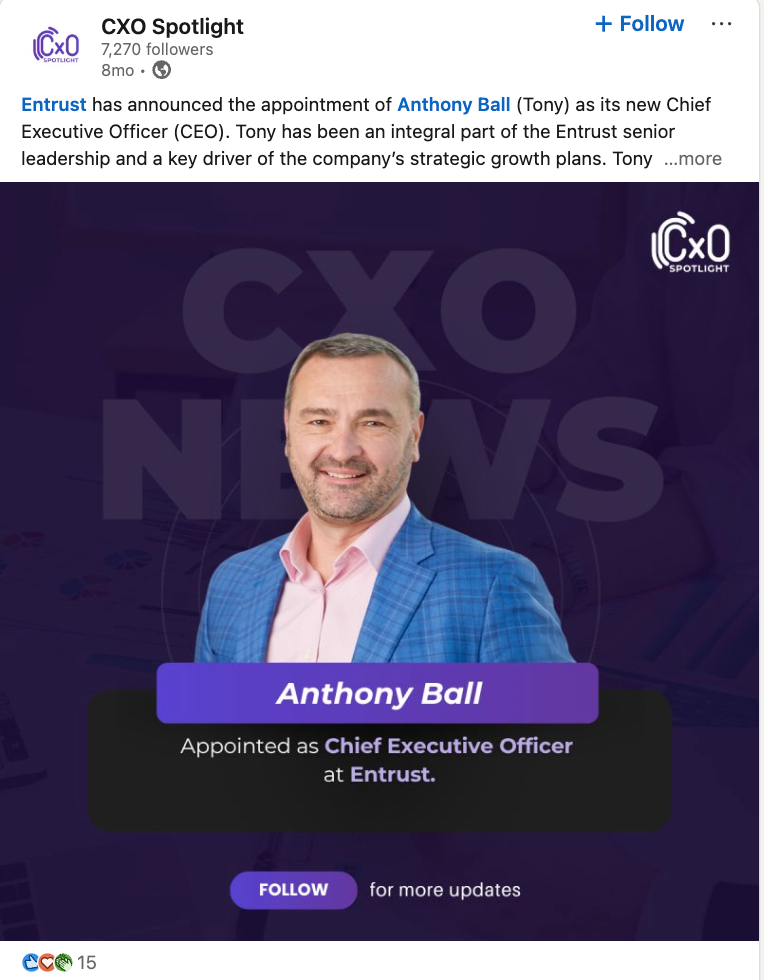Entrust has announced the appointment of Anthony Ball as its new Chief Executive Officer. The post states that Ball has been an integral part of the company’s senior leadership and a key driver of its strategic growth plans. His appointment places a longtime internal leader at the top of the organization as Entrust continues its next phase of execution.