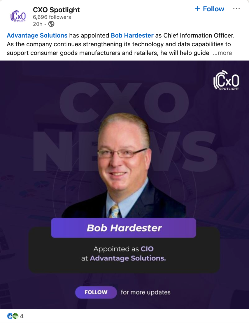 Advantage Solutions has appointed Bob Hardester as Chief Information Officer, effective March 2, 2026. He joins the company as it continues to strengthen its technology and data capabilities in support of consumer goods manufacturers and retailers. In the role, Hardester will lead Advantage Solutions’ enterprise information technology organization, overseeing global IT systems and advancing the digital capabilities that support clients, customers, and internal teams.