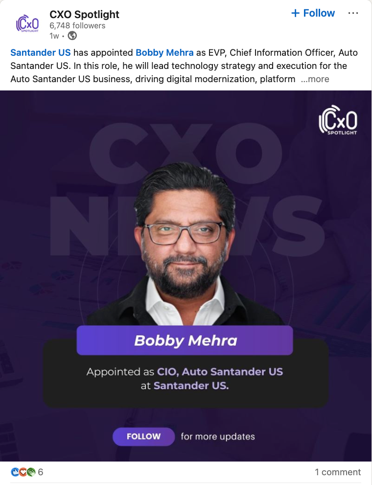 Santander US has appointed Bobby Mehra as Executive Vice President and Chief Information Officer, Auto Santander US. In the role, he will lead technology strategy and execution for the Auto Santander US business, with a mandate focused on digital modernization, platform advancement, and operational execution. The appointment reflects the company’s continued investment in technology leadership across its auto finance operations.