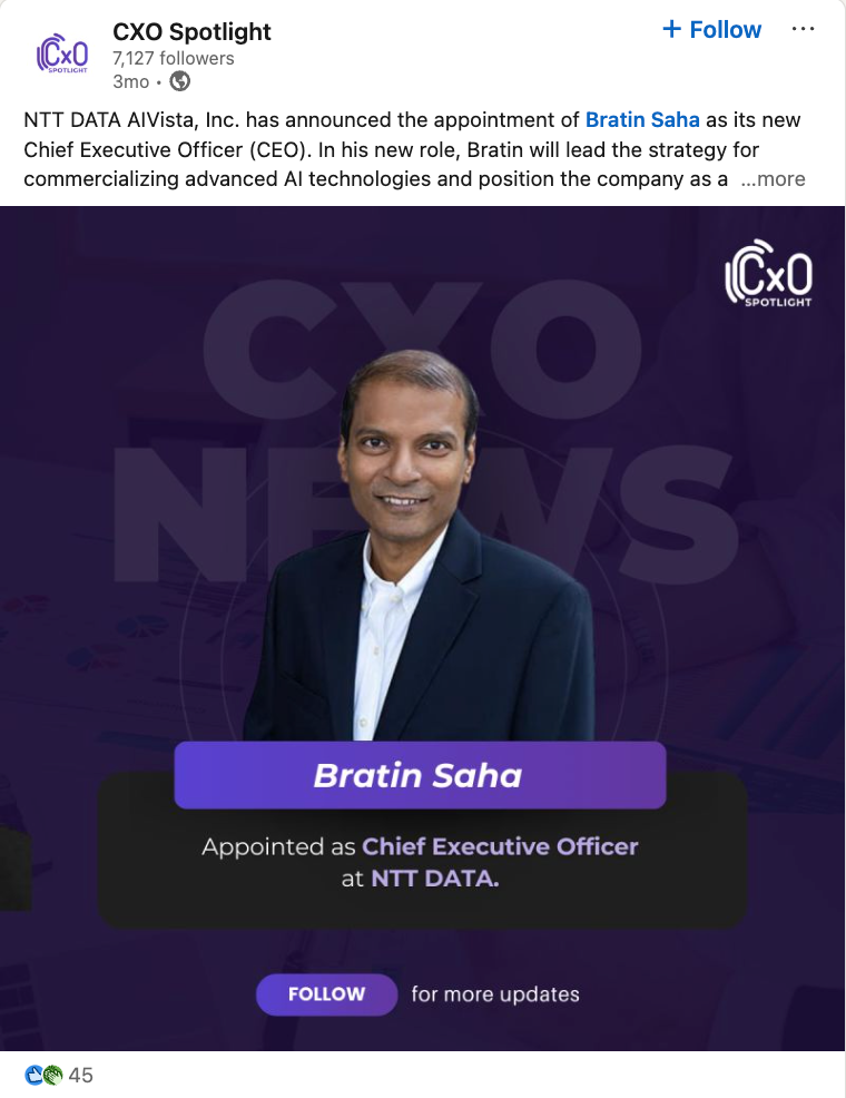 NTT DATA AIVista, Inc. has announced the appointment of Bratin Saha as its new Chief Executive Officer. In this role, he will lead the company’s strategy for commercializing advanced AI technologies and help position the business as a key vehicle for accelerating AI-native growth within the broader NTT DATA ecosystem. The appointment comes as NTT DATA AIVista expands its focus on building and scaling advanced AI offerings.