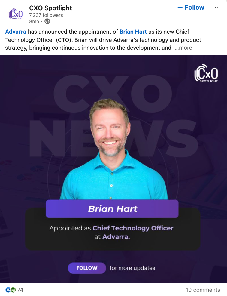 The LinkedIn post positions Hart as a senior technology leader stepping into a role that spans both platform direction and product execution. Based on the visible portion of the snapshot, Advarra is bringing him in to connect technology leadership more directly with product strategy and innovation. The screenshot does not include his prior company history, so no additional career background is available from the provided post image.
