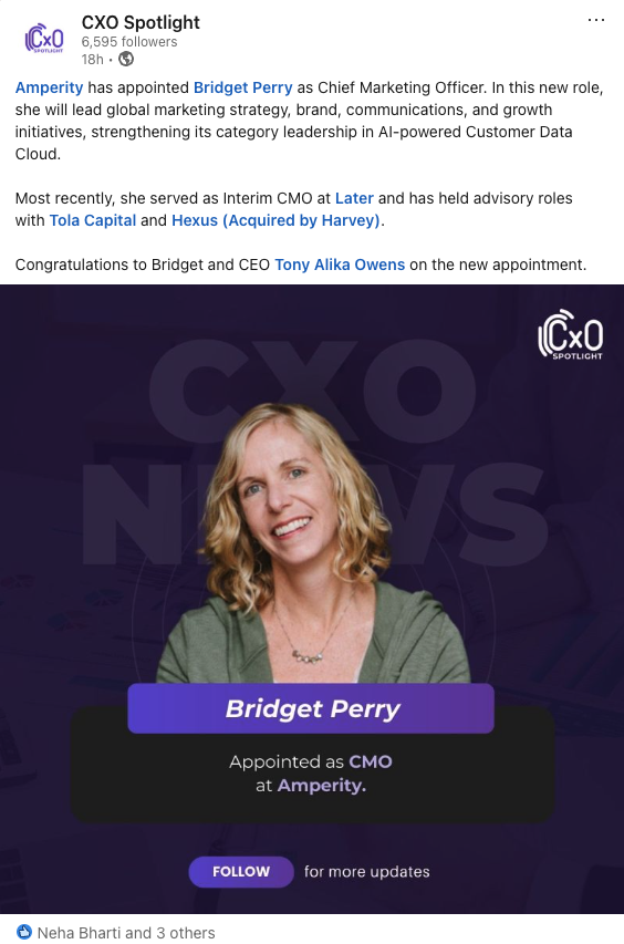 Why this matters: Amperity is doubling down on category ownership in the AI-powered CDP space, and bringing in a seasoned marketing executive signals they're ready to play offense. Perry's background spanning SaaS growth, advisory, and interim leadership suggests she's built for fast-moving environments, exactly what a company pushing for category dominance needs at the CMO seat.