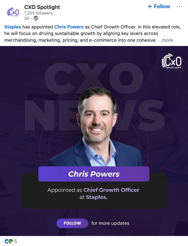 Powers is a long-tenured Staples executive who has held multiple leadership roles across the company over the years. Publicly available profile information shows he previously worked at Staples in investor relations and has continued to advance within the organization before being promoted to Chief Growth Officer. His appointment reflects an internal elevation rather than an external hire, indicating confidence in a leader with deep familiarity across Staples’ business.