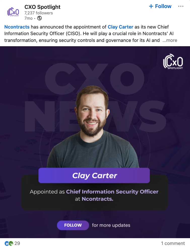 Carter brings nearly 20 years of cybersecurity leadership experience to the role. He joins Ncontracts from Nielsen, where he served as Senior Vice President and Chief Information Security Officer, overseeing security operations during a major go-private transaction and multiple portfolio changes. Prior to Nielsen, he held senior product security leadership roles at Xylem Inc. and GE Digital, where he built and scaled security programs tied to critical infrastructure and enterprise technology environments.