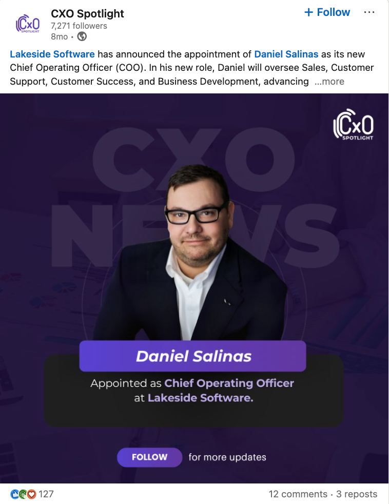 Lakeside Software has appointed Daniel Salinas as its new Chief Operating Officer. In this role, he will oversee Sales, Customer Support, Customer Success, and Business Development, helping advance the company’s operational and commercial execution. The appointment places Salinas in a key leadership role as Lakeside Software continues to align growth functions across the business.