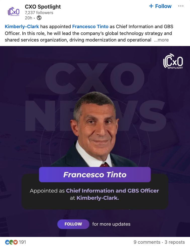 Francesco Tinto appointed at Kimberly-Clark as Chief Information and Global Business Services Officer, joining from Advantage Solutions.