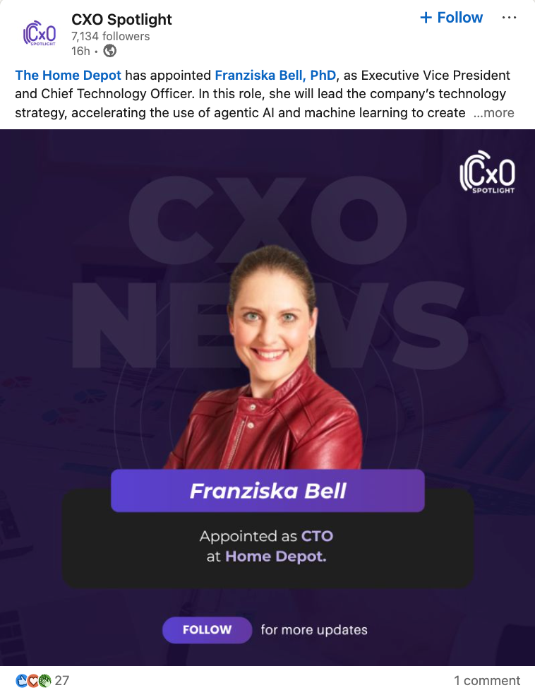 The Home Depot has appointed Franziska Bell, PhD, as Executive Vice President and Chief Technology Officer. In this role, she will lead the company’s technology strategy, accelerating the use of agentic AI and machine learning to create a more seamless, interconnected, and data-driven experience across the business. Bell will oversee the strategy, development, and alignment of technology, product management, data, and artificial intelligence for the company.