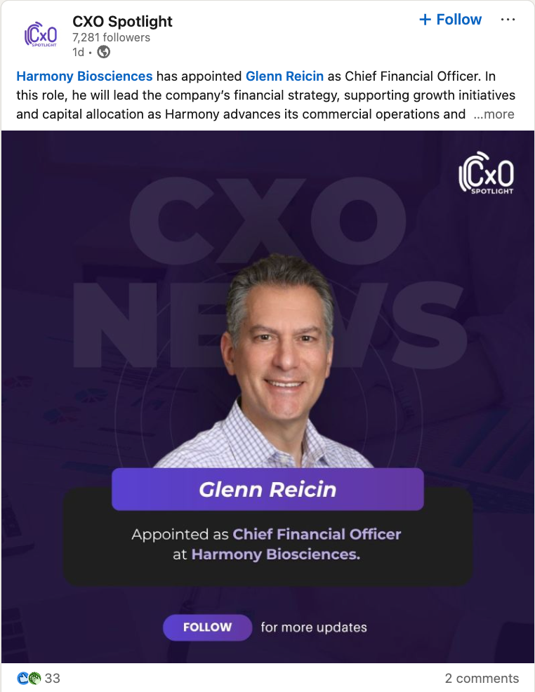 Harmony Biosciences has appointed Glenn Reicin as Chief Financial Officer. In this role, he will lead the company’s financial strategy, supporting growth initiatives and capital allocation as Harmony advances its commercial operations. The appointment places Reicin in a key leadership role as the company continues to align finance with its next phase of business execution.