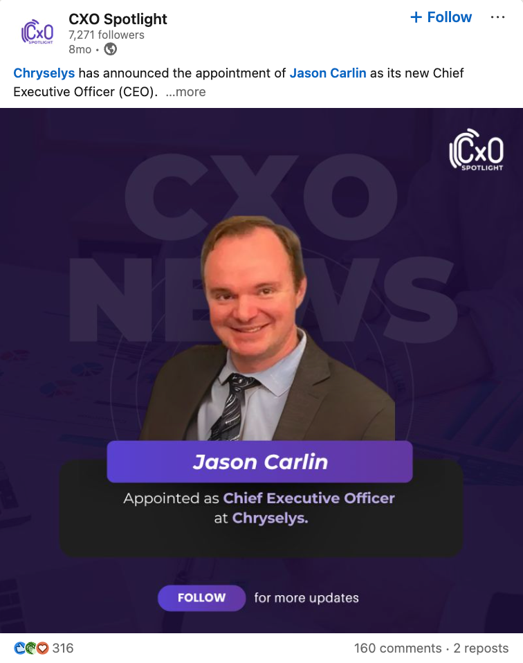 Chryselys has announced the appointment of Jason Carlin as its new Chief Executive Officer. The visible post confirms the leadership change but does not include further details about his mandate or strategic priorities in the cropped screenshot. Based on the source provided, the key fact is that Carlin has been named CEO of the company.