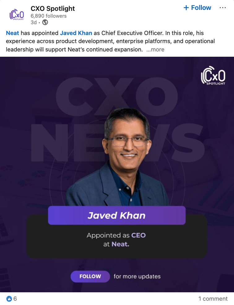 Neat has appointed Javed Khan as Chief Executive Officer. In the role, he will support the company’s continued expansion, drawing on his experience across product development, enterprise platforms, and operational leadership. The appointment signals Neat’s intent to deepen its investments in AI as it enters its next phase of global growth.
