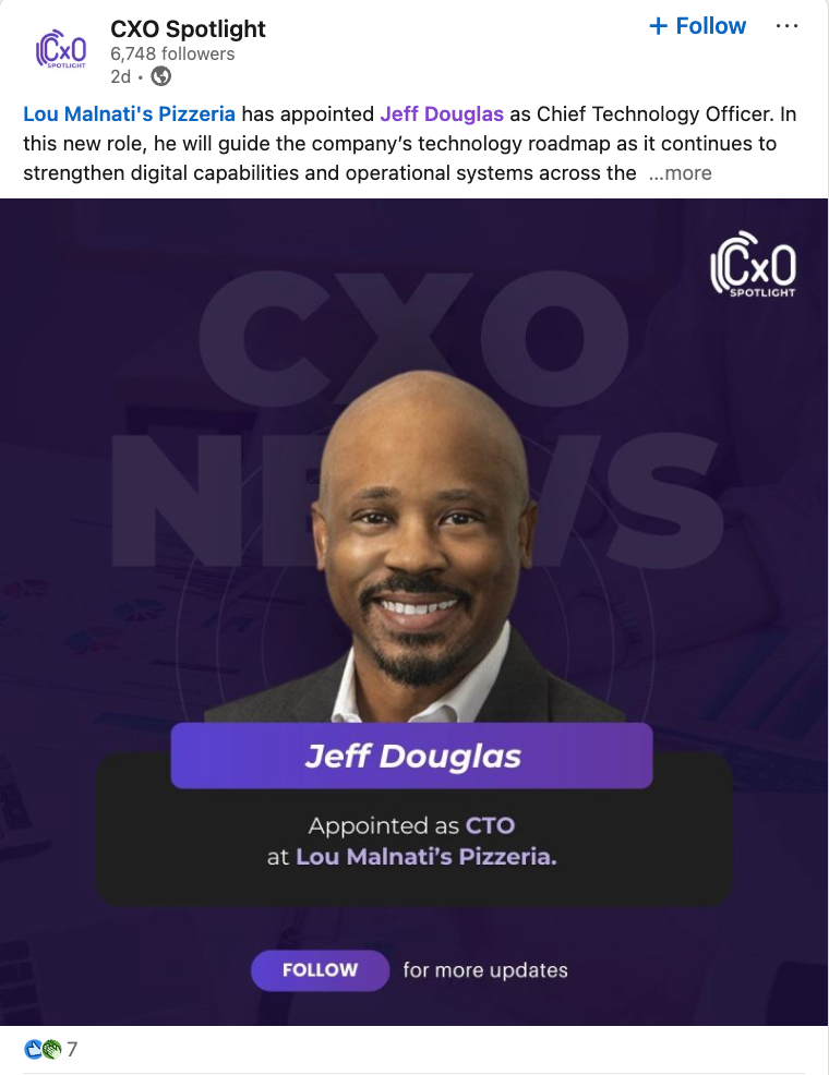Lou Malnati's Pizzeria has appointed Jeff Douglas as Chief Technology Officer. In the role, he will guide the company’s technology roadmap as it continues to strengthen digital capabilities and operational systems across the business. The company said Douglas brings more than 20 years of experience leading technology strategy, development, and operations, with a mandate centered on business impact and team leadership.