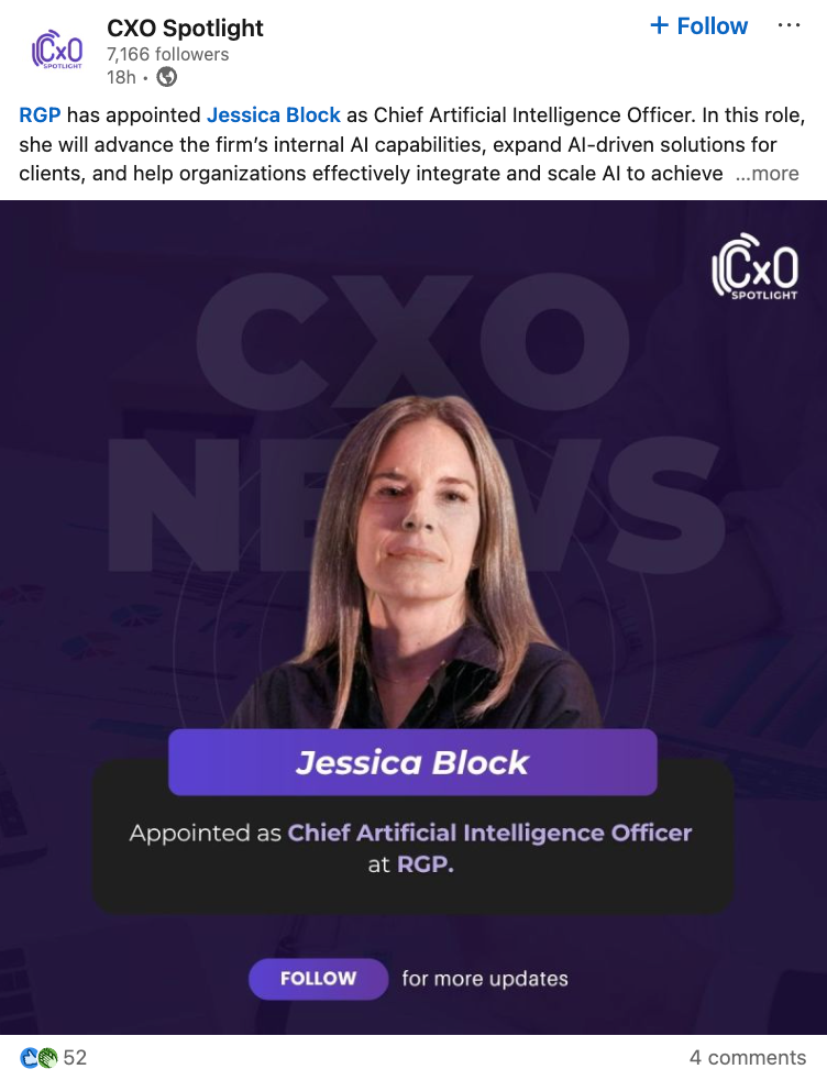 RGP has appointed Jessica Block as Chief Artificial Intelligence Officer. In this role, she will advance the firm’s internal AI capabilities, expand AI-driven solutions for clients, and help organizations effectively integrate and scale AI to achieve business outcomes. The appointment reflects RGP’s move to place AI more centrally within both its operating model and client offerings.