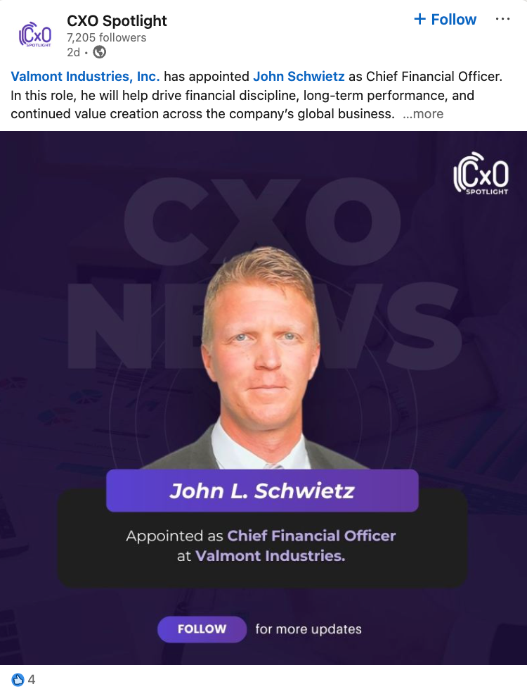 Valmont Industries, Inc. has appointed John L. Schwietz as its Chief Financial Officer. In this role, he will help drive financial discipline, long-term performance, and continued value creation across the company’s global business. The appointment became effective on April 8, 2026, and expands Schwietz’s responsibilities to include leadership of Valmont’s finance organization and corporate secretary duties.