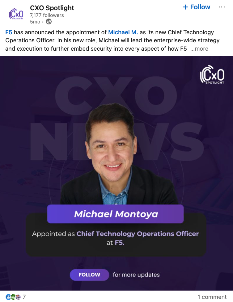 Before joining F5’s executive team, Montoya served as Chief Operating Officer at BlueVoyant, where he was responsible for product, engineering, and operations. Earlier in his career, he held Chief Information Security Officer roles at Equinix and Digital Realty, and also held senior leadership positions at Microsoft, FireEye/Mandiant, and EMC. He additionally served on F5’s Board of Directors before transitioning into this operating role.