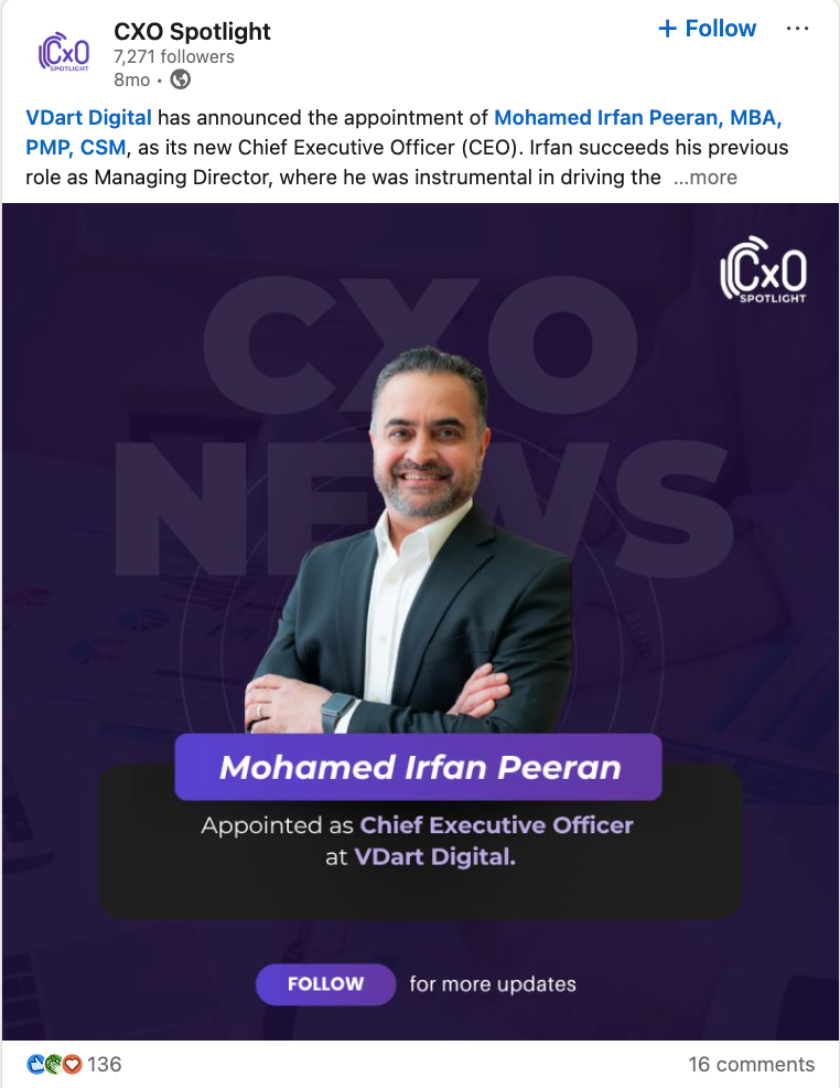 VDart Digital has appointed Mohamed Irfan Peeran as its new Chief Executive Officer. He succeeds from his previous role as Managing Director, where he played a central role in driving the company’s growth and direction. The appointment marks a leadership transition built on internal continuity, with Peeran moving into the top executive role after serving in a senior operating position.
