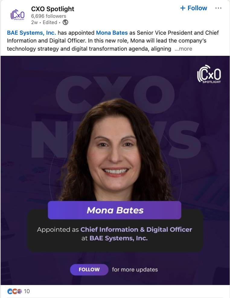 Bates brings more than 20 years of IT and business experience across industry and government. She joins BAE Systems from Collins Aerospace, where she most recently served as Chief Digital Officer, following earlier roles within RTX and its predecessor organizations over a 15-year span. Her background includes enterprise technology leadership across aerospace, defense, and digital transformation environments.