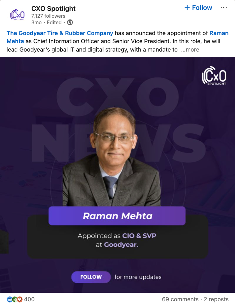 Before joining Goodyear, Mehta most recently served as Senior Vice President and Chief Information Officer at Johnson Electric. Earlier in his career, he held executive technology leadership roles at Visteon, Fabrinet, and EWIE, building experience across automotive, manufacturing, and industrial technology environments in North America and Asia. Under his leadership, three organizations received the CIO 100 Award for technology innovation and business value creation.