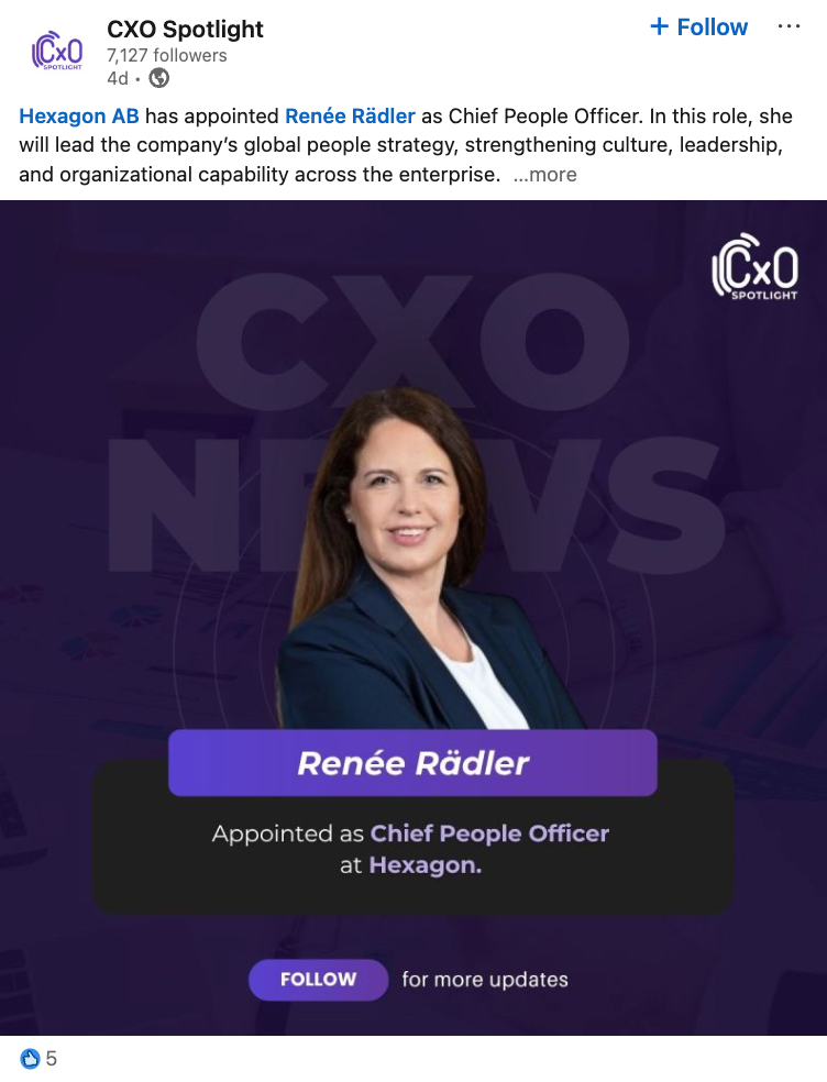 Hexagon AB has appointed Renée Rädler as Chief People Officer. In this role, she will lead the company’s global people strategy, strengthening culture, leadership, and organizational capability across the enterprise. The role is newly created, and Rädler joined Hexagon’s Executive Management Team effective 1 April 2026.
