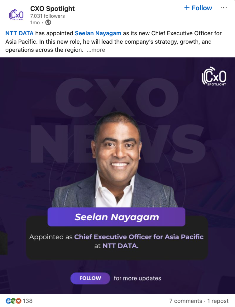 The visible portion of the provided post snapshot does not include additional detail on Nayagam’s prior roles or broader career background. Based on the announcement alone, NTT DATA is positioning him as a senior regional executive responsible for driving business performance and operational execution across Asia Pacific. More source detail would be needed to expand this section without introducing unsupported information.