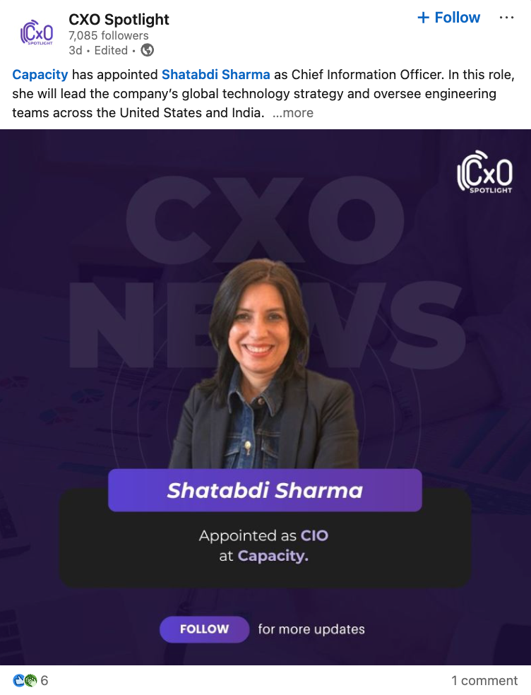 Capacity has appointed Shatabdi Sharma as Chief Information Officer. In this role, she will lead the company’s global technology strategy and oversee engineering teams across the United States and India. The appointment positions Sharma to shape the technology foundation behind Capacity’s next phase of operational growth.