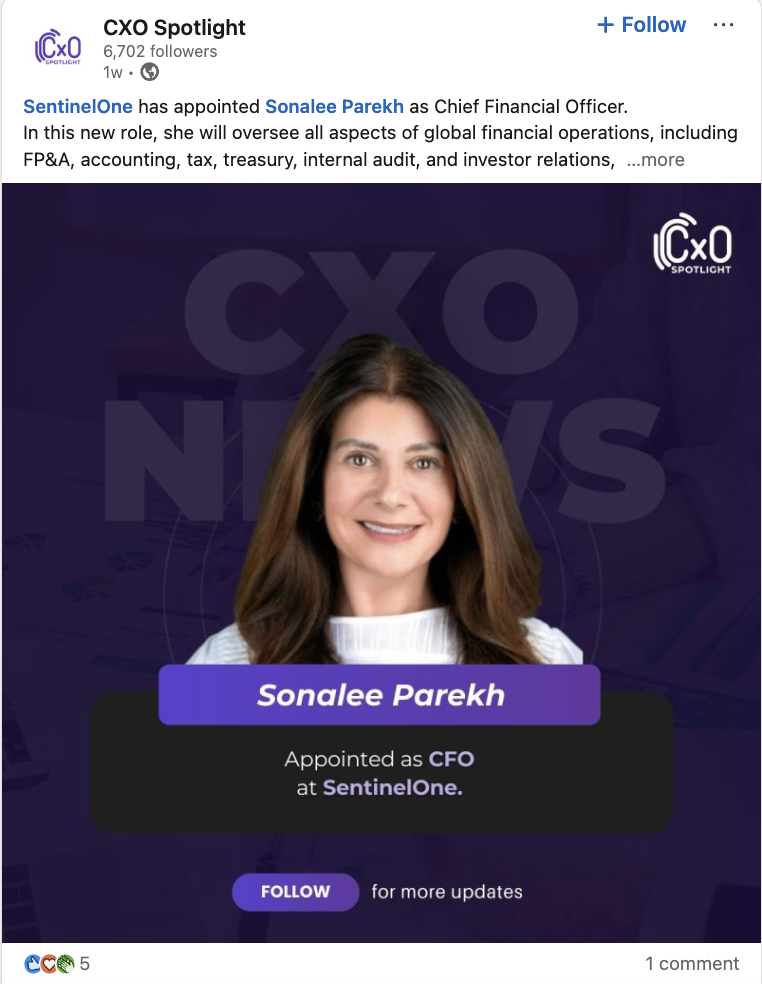 SentinelOne has appointed Sonalee Parekh as Chief Financial Officer. In the role, she will oversee the company’s global financial operations, including FP&A, accounting, tax, treasury, internal audit, and investor relations. The appointment is effective March 24, 2026, as SentinelOne continues to scale its AI-native cybersecurity platform.