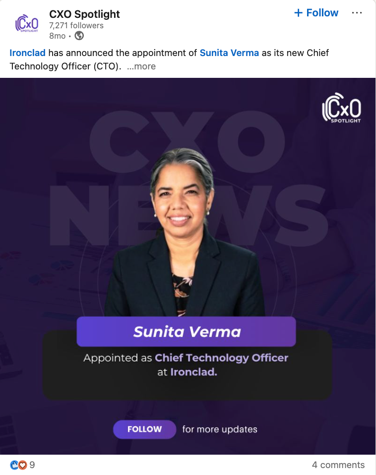 Ironclad has appointed Sunita Verma as its new Chief Technology Officer. The announcement names Verma as the company’s senior technology leader, placing her in charge of the technology function as Ironclad continues to build and scale its platform. The appointment adds new technical leadership at a time when software companies are under pressure to strengthen product execution, platform reliability, and innovation.