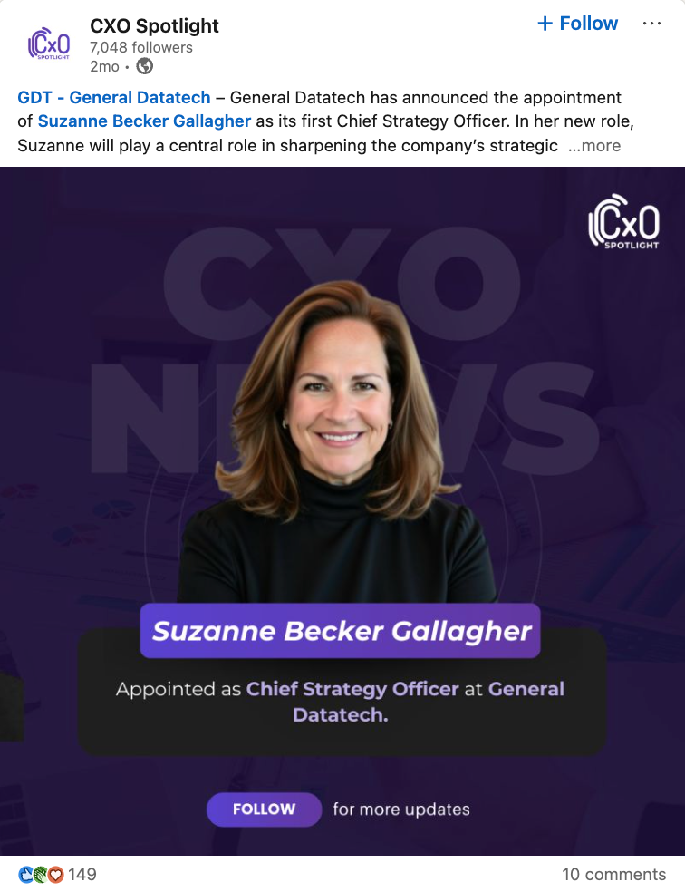 The visible portion of the provided post snapshot does not include details on Gallagher’s prior roles or previous company. Based on the announcement alone, General Datatech is positioning her as a senior executive focused on strategy and enterprise direction. Additional source detail would be needed to expand this section further without introducing assumptions.