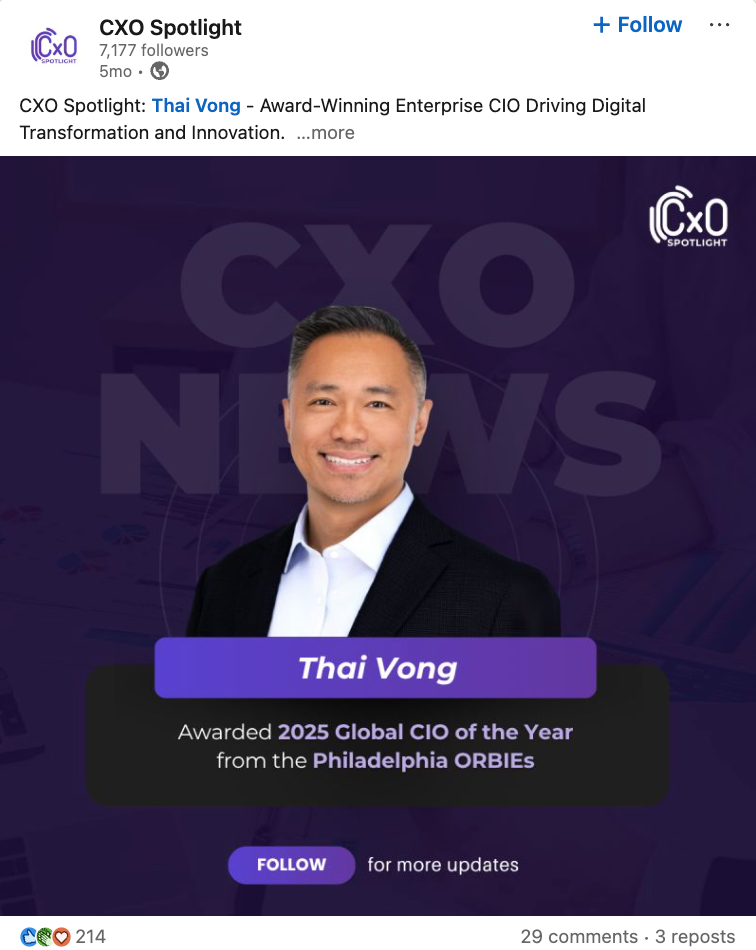 Thai Vong has been recognized as the 2025 Global CIO of the Year by the Philadelphia ORBIE Awards. The recognition highlights his leadership in digital transformation, innovation, and enterprise technology strategy. Vong currently serves as Chief Information Officer at ACR, also referenced as AmerCareRoyal, where he leads large-scale modernization and technology-driven business transformation.