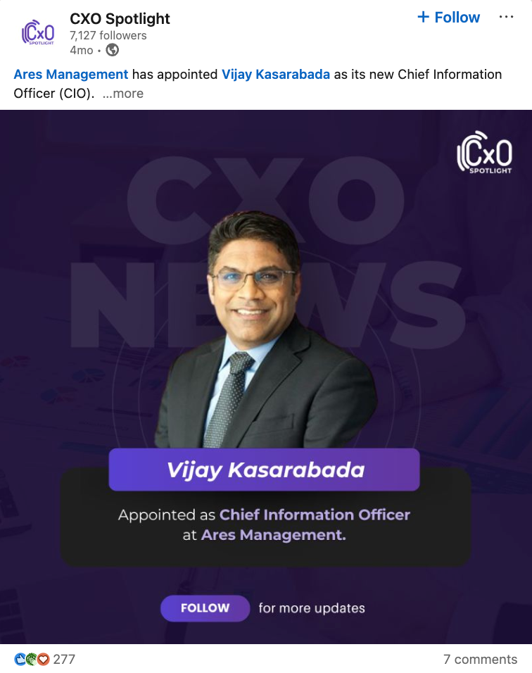 Kasarabada brings more than 27 years of leadership experience across technology, data management, cybersecurity, and operations in global financial institutions. Before joining Ares, he served as Chief Information Officer at Nuveen, the asset management subsidiary of TIAA, and earlier as Chief Technology Officer at Lazard. Prior to that, he spent 11 years at BlackRock in several leadership roles, including Head of Alternatives Technology.