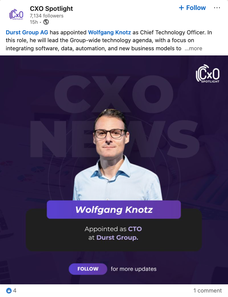 Why this matters: This appointment signals that Durst is treating technology leadership as central to its next phase of growth, not just to product development. Elevating a long-time internal operator with deep knowledge of both hardware and software integration suggests the company wants continuity as it pushes further into connected, data-driven, and automated production systems.